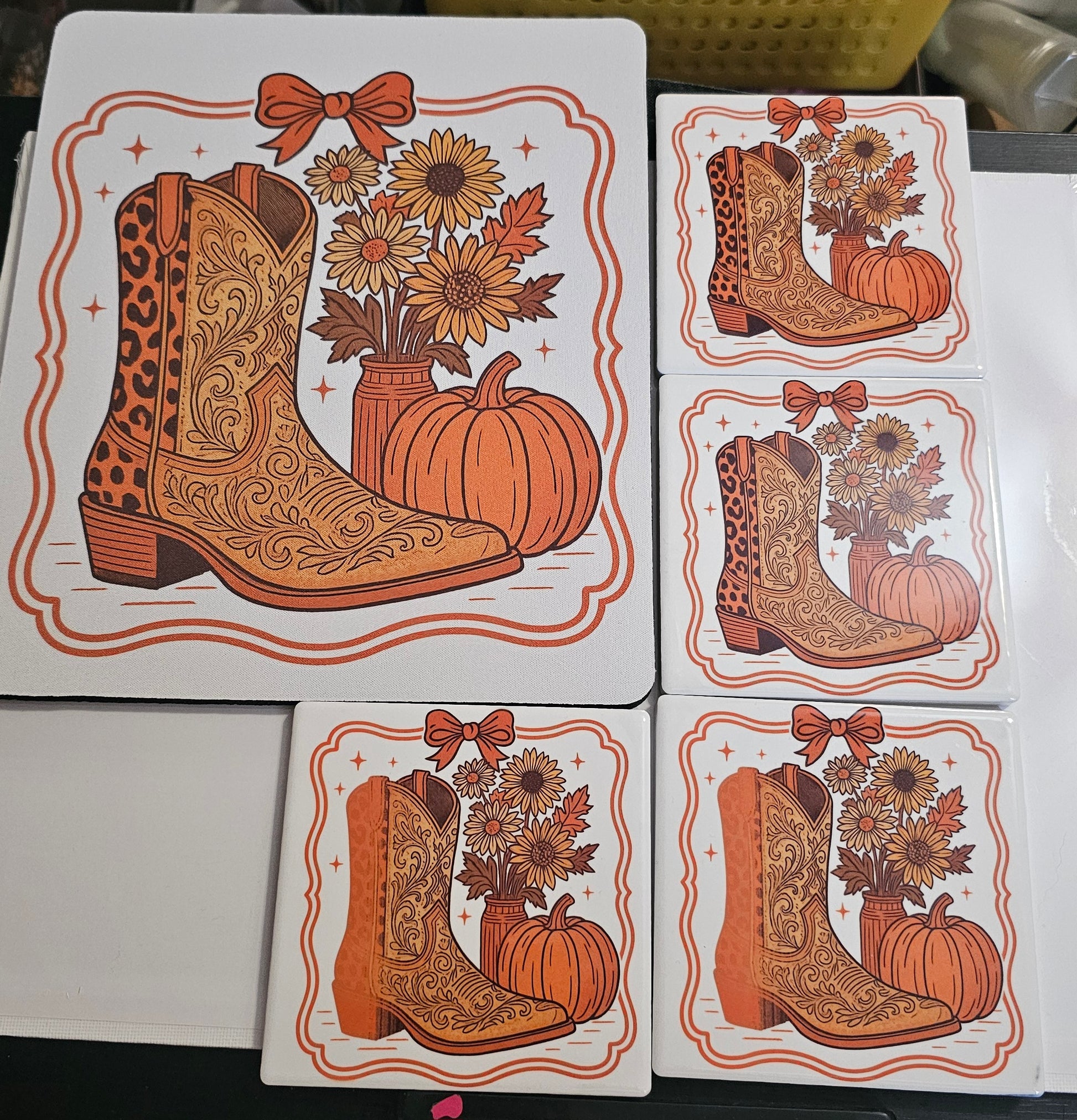 MOUSE PAD AND 4 MATCHING CERAMIC COASTERS.